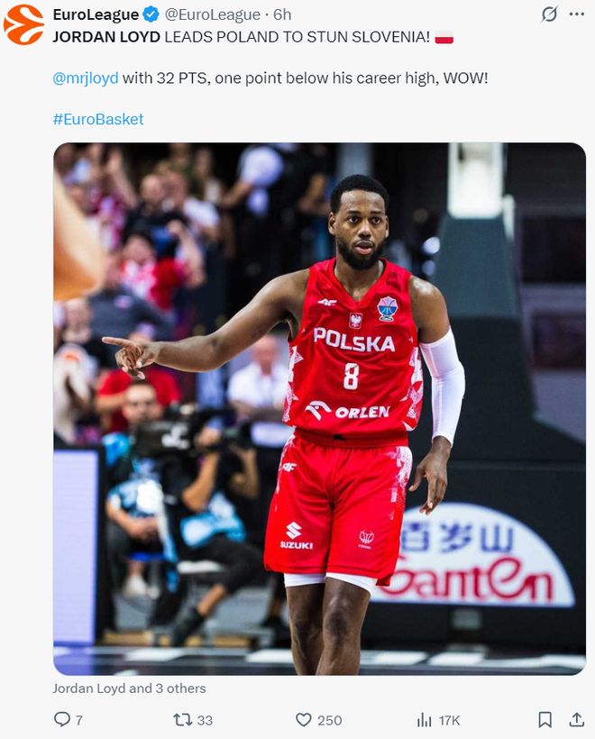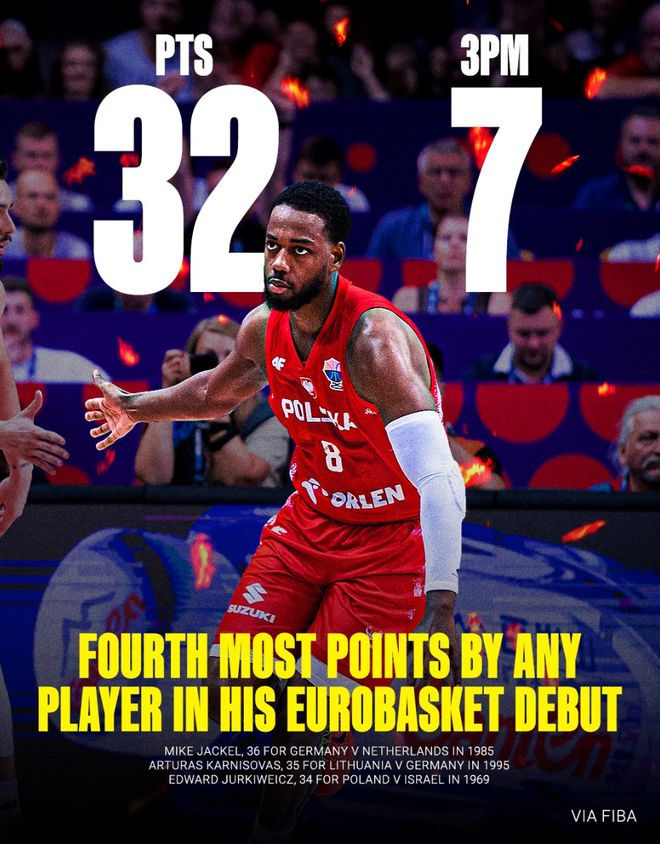 三分8中7轟32分:波蘭歸化對(duì)轟東皇不遜色成歷史第4人被贊如喬丹