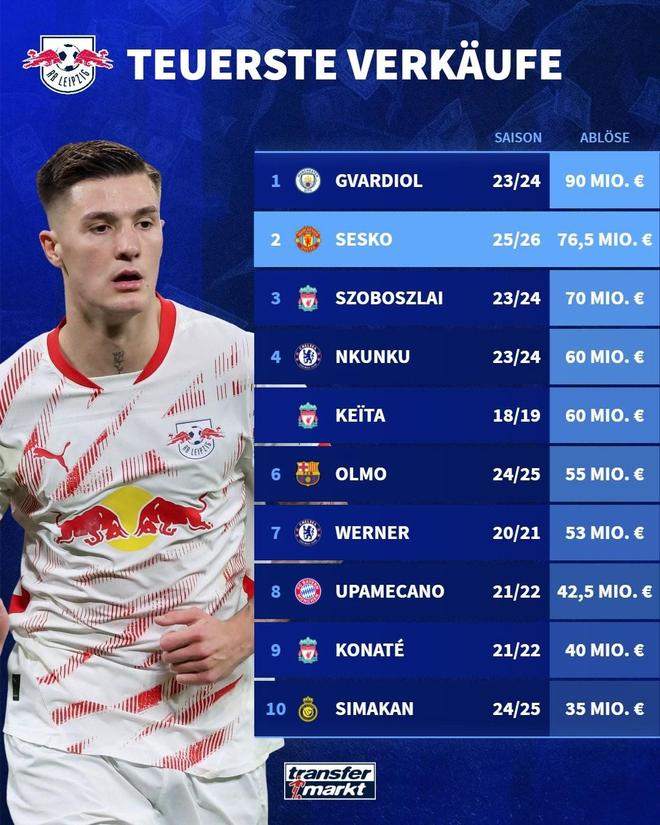 萊比錫隊史轉(zhuǎn)會收入最高榜:前五均來自英超,謝什科第二