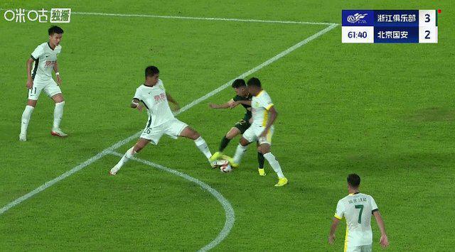 第62分鐘,浙江隊(duì)程進(jìn)帶球被國(guó)安多人圍搶?zhuān)?jīng)過(guò)VAR裁判提醒,確認(rèn)在這個(gè)過(guò)程中,程進(jìn)步伐錯(cuò)亂有踩踏犯規(guī)的行為,最終確認(rèn)將程進(jìn)紅牌罰下場(chǎng),浙江隊(duì)少一人作戰(zhàn)。隨后,國(guó)安進(jìn)行換人調(diào)整,乃比江·莫合買(mǎi)提換下塞爾吉尼奧。
