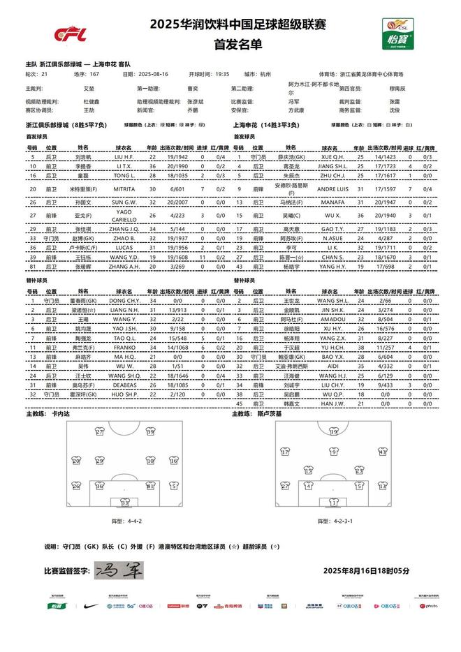 浙江vs申花:雙方均三外援出戰(zhàn),王鈺棟、楊皓宇首發(fā)