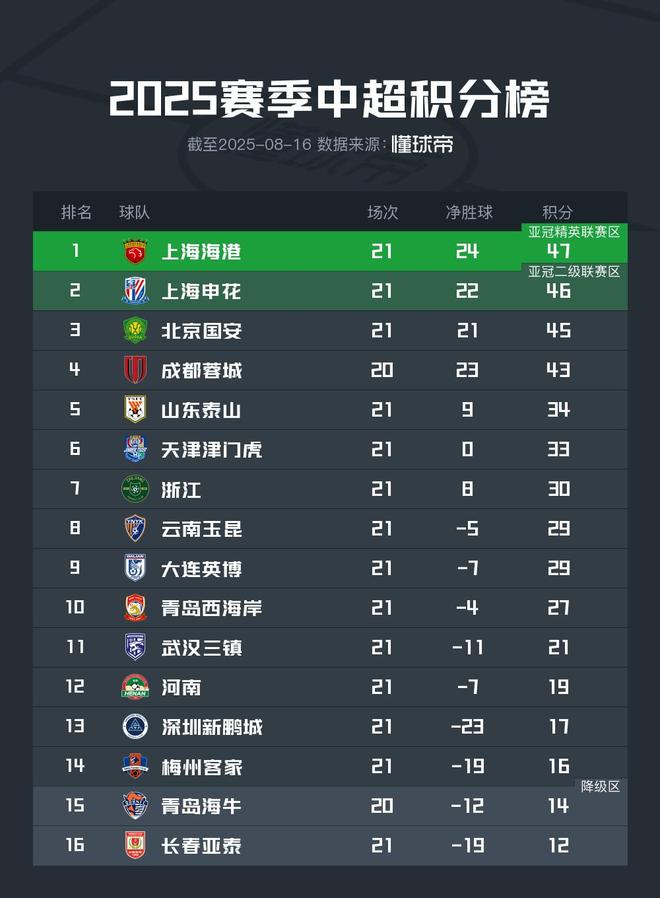 中超積分榜:海港3連勝登頂,申花3輪不勝跌至次席