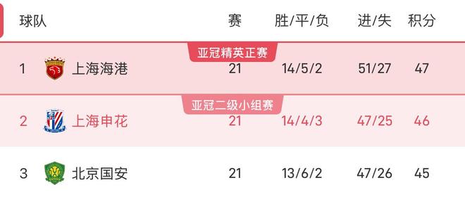 中超積分榜:海港3連勝47分居首,申花近3輪不勝46分列次席