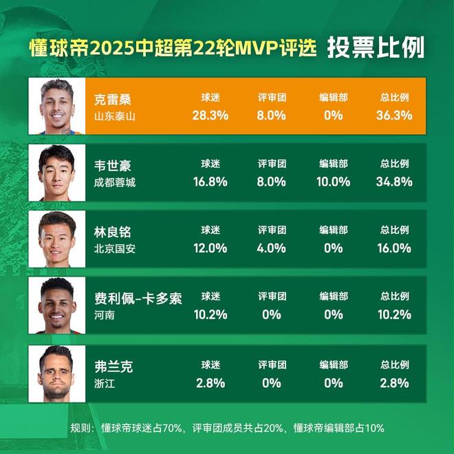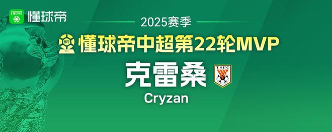 懂球帝2025賽季中超第22輪MVP:克雷桑