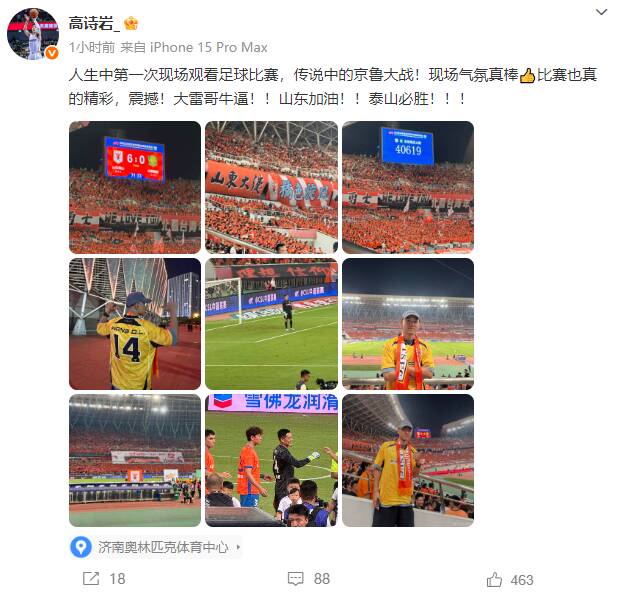 山東高速男籃隊(duì)員高詩巖現(xiàn)場(chǎng)觀看京魯大戰(zhàn),并發(fā)文:泰山必勝