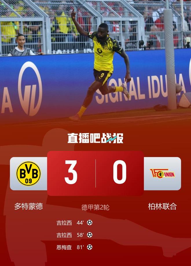 德甲多特蒙德30柏林聯(lián)合取賽季首勝吉拉西梅開二度恩梅查建功