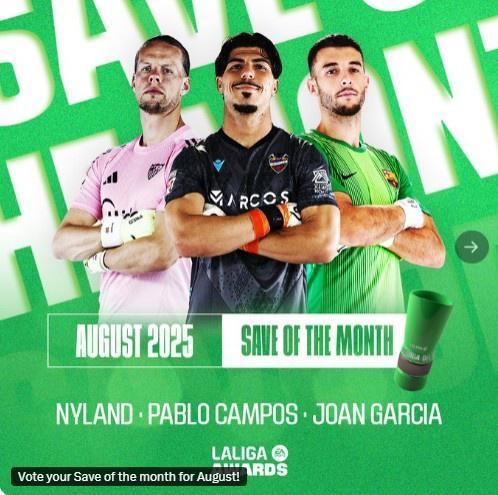 - 西甲8月最佳撲救候選:霍安加西亞撲出巴列卡諾近距離包抄入圍